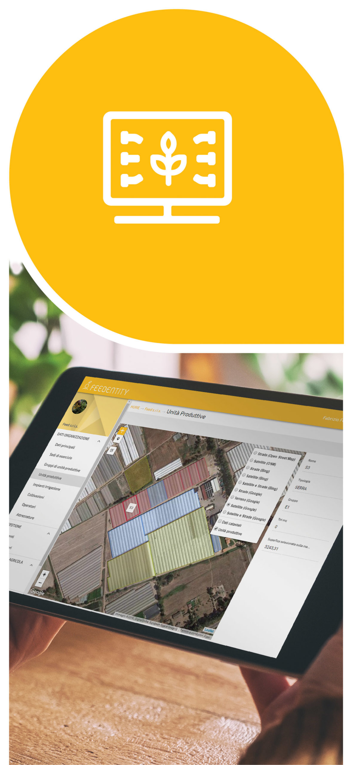 Feedentity gestisce tutte le attività e ottimizza i processi aziendali; inoltre organizza in modo efficiente lo scambio di informazioni tra collaboratori con strumenti innovativi, semplici e pratici. Riduce i costi gestionali e amministrativi, permette di usufruire della competenza di un team di agrotecnici e agronomi che ti aiuteranno a gestire l'attività di campo.